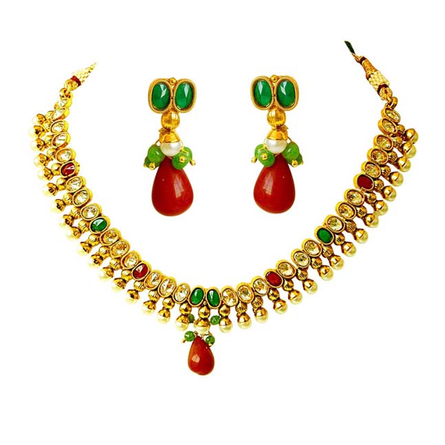 Drop Shaped Big Gold Plated Motif, Shell Pearl & Coloured Stone Necklace Set. Necklace Wt: 80.00 gms ...Read more