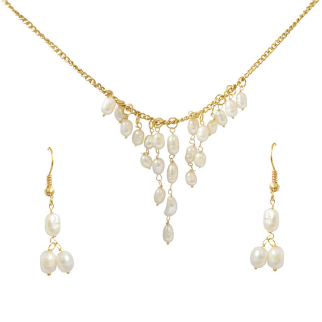 Fancy Drop Shaped Pink Stone & White Shell Pearl & Gold Plated Pendant Necklace & Earring Set (PS325)